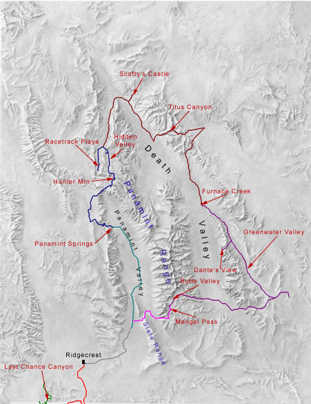 | Our route within Death Valley superimposed upon a shaded relief map. These routes were captured by our GPS, uploaded to our computer and placed on the relief map using the OziExplorer software. |